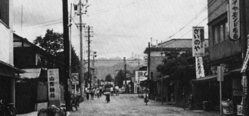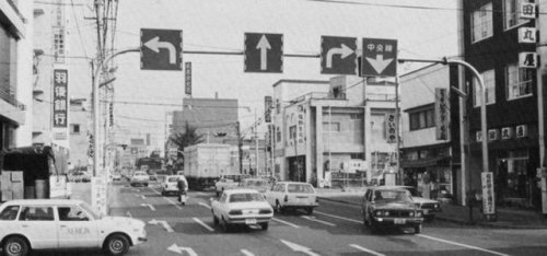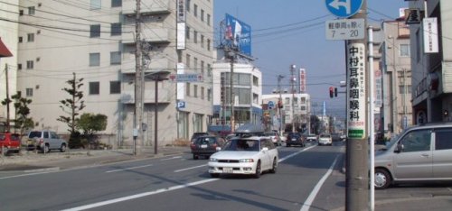 篠田病院前から東、左に羽後銀行、遠く大東京火災の屋上広告塔が見える。かつては風格に欠けたさびしい通りだった。