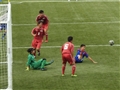 ゴールライン上あたりから、シュータリング。酒東GKとバーの間を狙ったシュータリングに、酒東GKが触った