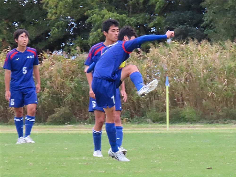 写真はシュンスケが手を上げて、FKを蹴ると見せかけて敵を欺き、コウタロウが狙ったが外れたシーン