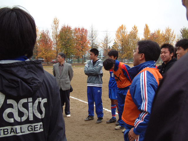 後半 風上で優位に立ったが決定的なチャンスなし。相手キーパーゴールキックとばないのでどんどんゴールライン割るボール蹴ればチャンスになったのに、やはりそこはサッカー紳士の山東、ズルイことは出来ない。途中からは蹴りあい的な試合になった。タイムアップ寸前左から相手フォワードに抜け出されキーパー阿波と一対一、ボールに行ったが相手フォワードの足とも交錯し一瞬インターハイの悪夢がよみがえったが、ことなきを得る。イライラがつのる筆者はベンチの大○顧問からタバコをせびって気を落ち着かせる。