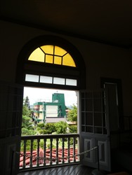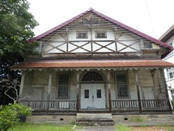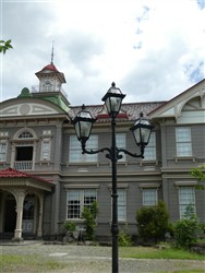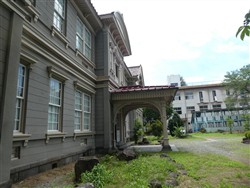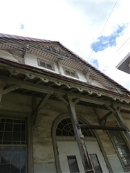 ルネサンス様式を基調とした木造桟(さん)瓦葺き二階建て。一階と二階の境に巡らせたコーニス(胴蛇腹)にこの様式の特徴が見られます。