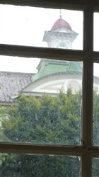 中央の屋根は櫛形、両端には切妻(きりづま)形の飾り破風(はふ)を見せ、その間にはドーマ(屋根窓)を設けています。