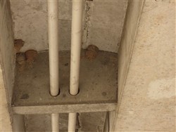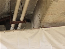 水道管の両側にツバメの巣があり、工事のためのシートが下に設置されています。