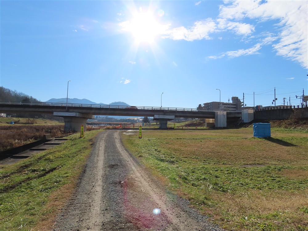 青空の下の馬見ヶ崎河川敷。双月橋を工事しているようだ。
