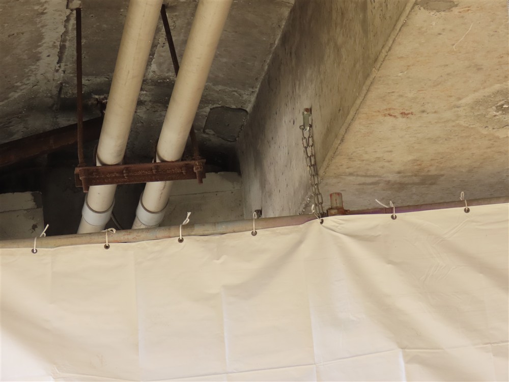 水道管の両側にツバメの巣があり、工事のためのシートが下に設置されています。