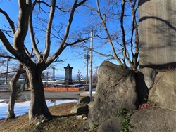 山形市薬師町方面(とか現在の緑町二丁目)にあったらしい、馬場とか競馬場が現在の山形市球技場になり、ここと護国神社との間に戦没軍馬慰霊碑が建っており、さらにその南側に【馬見ヶ崎川筋堤防落成記念碑】が建っております。 |