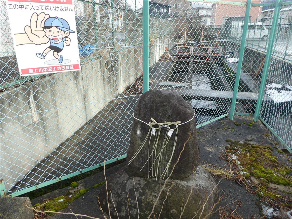山形大橋の下をくぐって、13号バイパスに上がる道路の東側に、その分水工はあります。記念碑にも正月飾り?が付けられています。